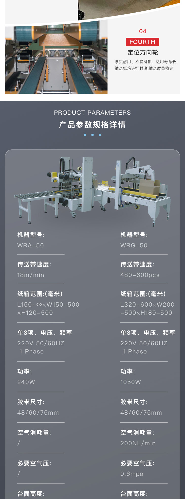 介紹:自動(dòng)四角邊封箱機(jī)WRA-50-WRG-50工型封箱機(jī)的成功研發(fā),填補(bǔ)了封箱機(jī)在面對(duì)特別行業(yè)需進(jìn)行角邊封箱空缺特別是針對(duì)與電子產(chǎn)業(yè)和需走海運(yùn)的行業(yè),90°轉(zhuǎn)角機(jī),氣缸自動(dòng)推箱;紙箱上下四個(gè)角邊同時(shí)自動(dòng)封箱,可與GPA/GPB/GPC機(jī)型聯(lián)機(jī)組合完成工字型封箱機(jī)。該款封箱機(jī)廣泛應(yīng)用于食品、日化、電子等行業(yè)。 產(chǎn)品別稱:全自動(dòng)封箱機(jī)、工字封箱機(jī)、一字封箱機(jī)、十字封箱機(jī)、四角邊封箱機(jī)、上下驅(qū)動(dòng)封箱機(jī)、左右驅(qū)動(dòng)封箱機(jī)、快遞封箱機(jī)、電商封箱機(jī)、膠帶封箱機(jī)、快速封箱機(jī)、可調(diào)封箱機(jī)、伺服封箱機(jī)